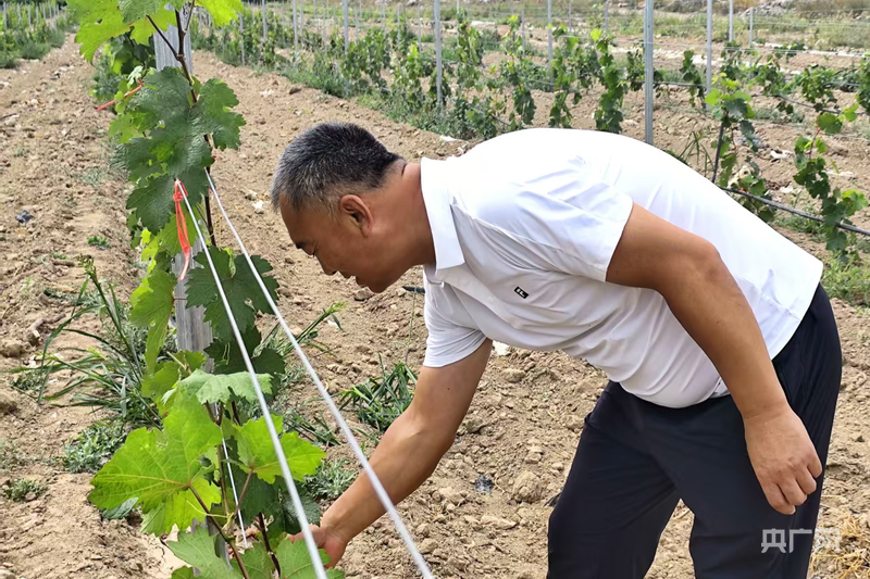昌吉市印象戈壁葡萄酒庄有限责任公司董事长富强在查看葡萄长势 (央广网发 马晓杉 摄)