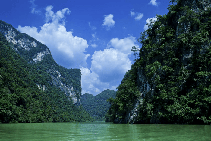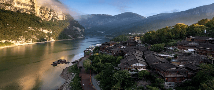 在重庆乌江・龚滩旅游度假区,西秦会馆每晚上演土家面具阳戏、乌江号子等非遗节目,打铁花与江涛声共谱“非遗浪漫”,非遗龚滩绿豆粉、土家宴席珍品烧白回味无穷,造就了乌江“山似三峡而水胜三峡,水似漓江而山胜漓江”的独美水墨画卷。