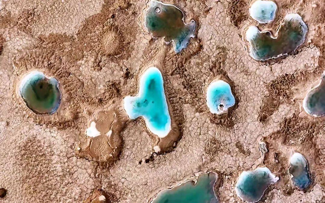 2.盐河、岸边和盐沼泽里,椭圆型居多的盐泉如同白玉圈子镶嵌的宝石,在成百上千的盐井中,最大的几个成为近似圆型的“蓝洞”,成为尕斯库勒湖周边典型的“大地之眼”——尕斯蓝洞: