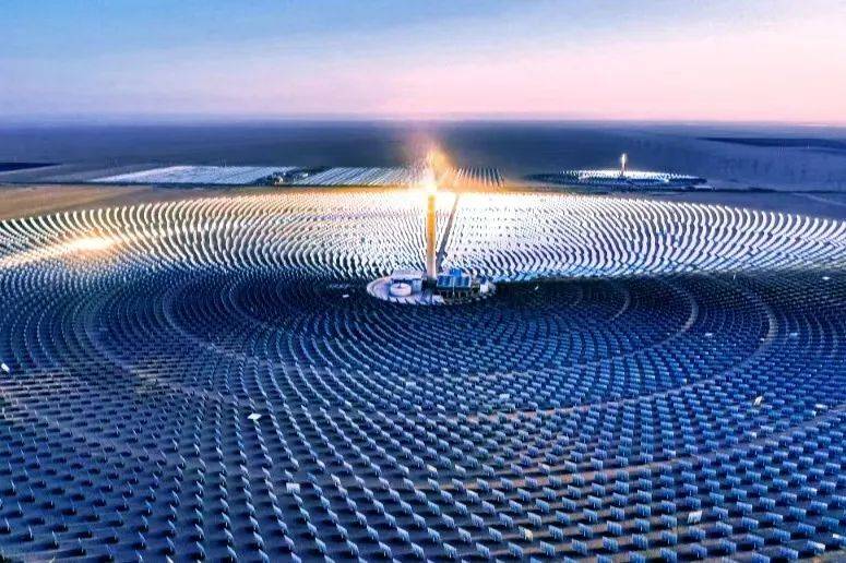 1.光热电站根据太阳能光热发电原理采用“光-热-电”的发电方式,成千上万的定日镜把太阳光反射到位于太阳塔顶的吸热器表面,通过传热介质产生500℃以上的蒸汽,推动蒸汽轮机发电——太阳发电站;